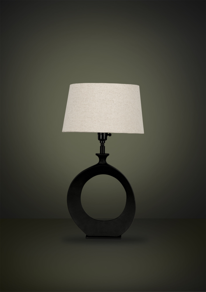 The Diezma table lamp illuminates any space with a touch of timeless elegance. This lamp features a sculptural matte black metal base with a smooth open circular design and a sleek natural linen drum shade. This lamp adds drama to any room of the house.