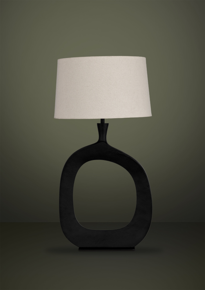 The Diezma table lamp illuminates any space with a touch of timeless elegance. This lamp features a sculptural matte black metal base with a smooth open circular design and a sleek natural linen drum shade. This lamp adds drama to any room of the house.